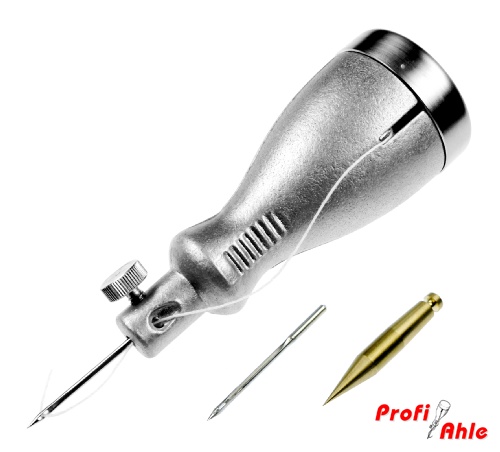 Profi-Ahle Set 1 - Profi-Ahle inkl. 2 Nadeln (Standard kurz und Leder), 1 Spule mit Nähgarn, Nähschiffchen, fünfsprachige Gebrauchsanleitung (deutsch, englisch, französisch, spanisch, holländisch), einzeln verpackt im Polybeutel mit Eurolochung
