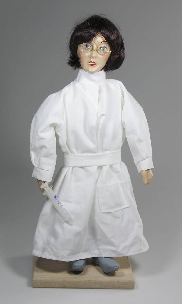 Dekofigur Ärztin, Handarbeit mit vielen liebevollen Details, Charakterkopf aus Keramik-Gießmasse, Kleidung maßgeschneidert, H: ca. 38 cm, optional mit individuellem Gravurschild