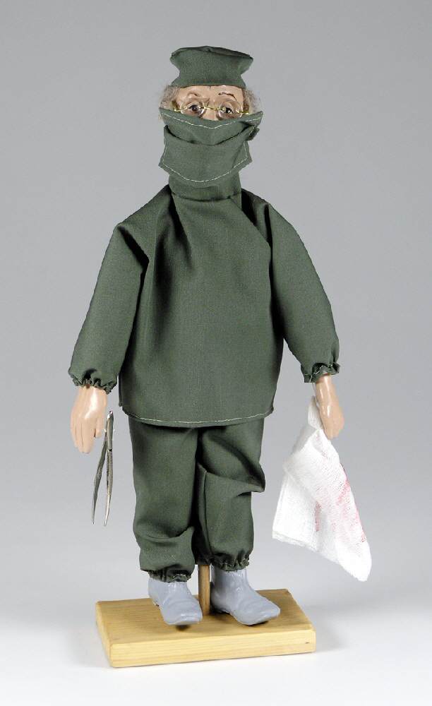 Dekofigur Chirurg, Handarbeit mit vielen liebevollen Details, Charakterkopf aus Keramik-Gießmasse, Kleidung maßgeschneidert, H: ca. 30 cm, optional mit individuellem Gravurschild