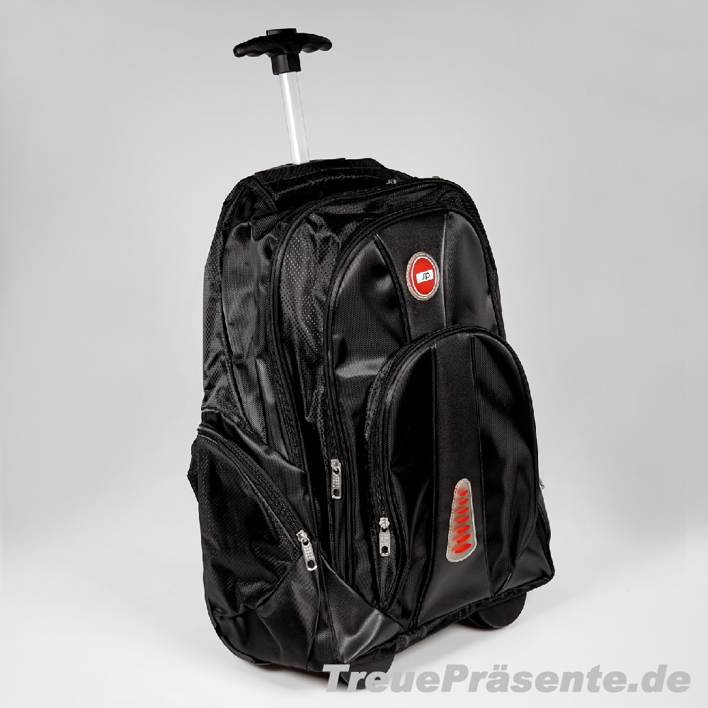 Trolley-Rucksack schwarz mit Teleskop-Griff und abdeckbaren Rollen, fünf Fächer