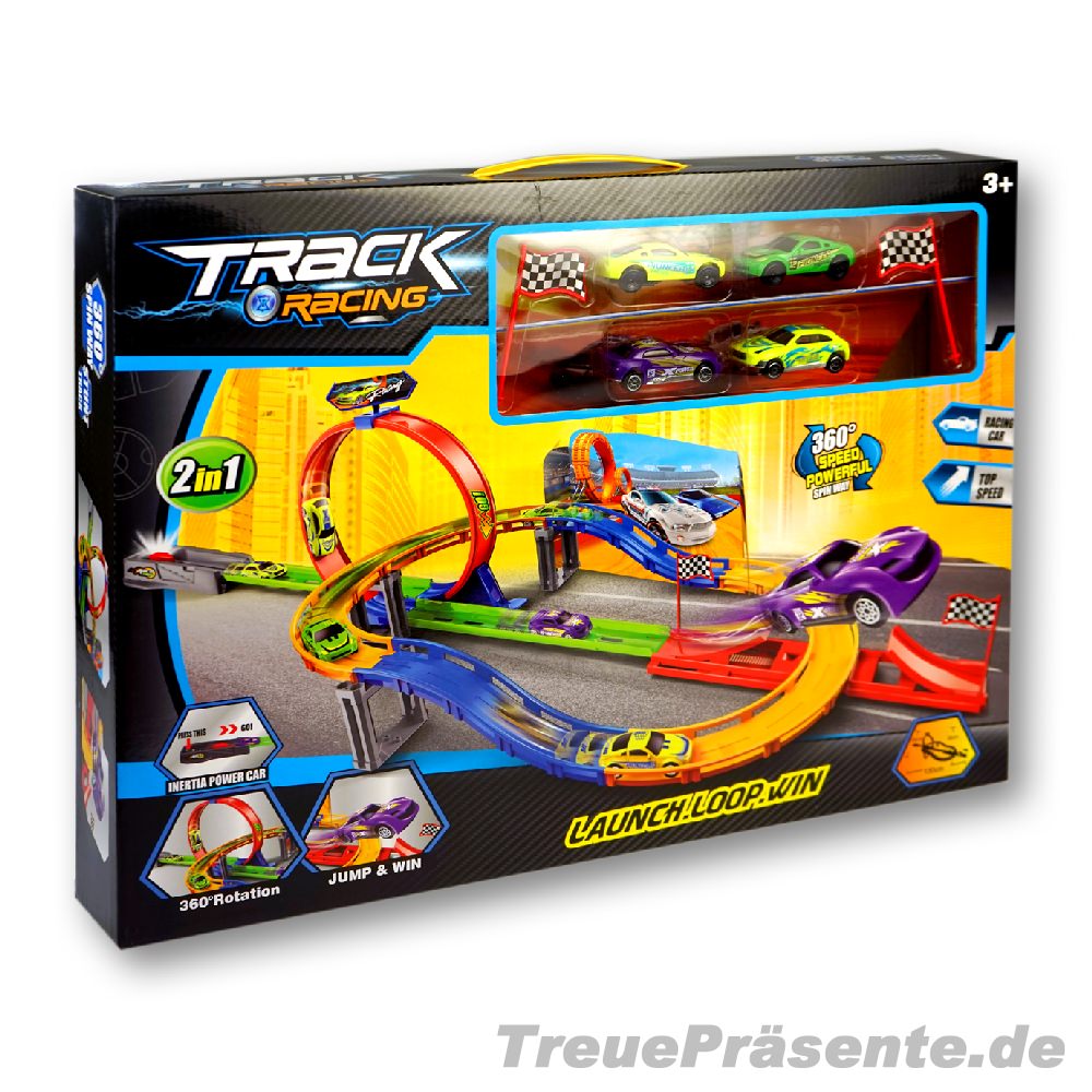 Auto-Rennbahn mit Looping 2in1 mit vier aufziehbaren Autos und zwei unterschiedlichen Strecken