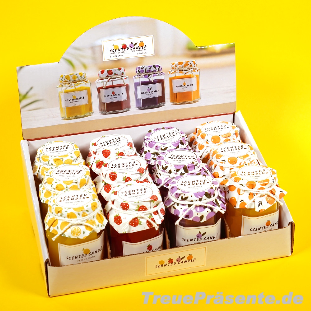 Duftkerze im Glas, vier Frucht-Düfte im 12er-Displ