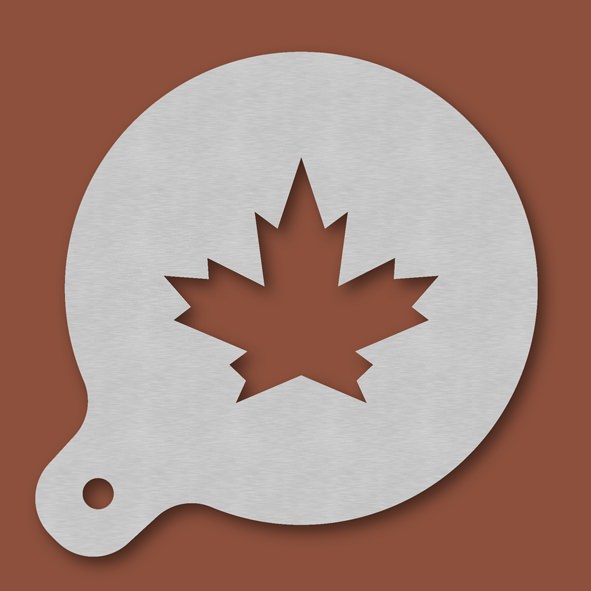 Cappuccino-Schablone Ahornblatt, Außendurchmesser 120 mm, Motivdurchmesser ca. 70 mm, aus Edelstahl mit Handgriff und integriertem Aufhänger, spülmaschinengeeignet, Lieferung in Verkaufsverpackung mit Kartoneinlage und Bedienungsanleitung
