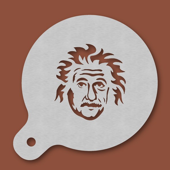 Cappuccino-Schablone Albert Einstein, Außendurchmesser 120 mm, Motivdurchmesser ca. 70 mm, aus Edelstahl mit Handgriff und integriertem Aufhänger, spülmaschinengeeignet, Lieferung in Verkaufsverpackung mit Kartoneinlage und Bedienungsanleitung