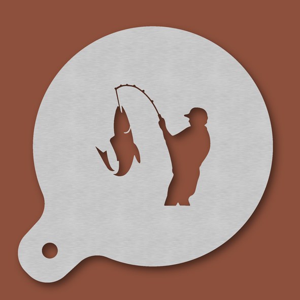 Cappuccino-Schablone Angler, Außendurchmesser 120 mm, Motivdurchmesser ca. 70 mm, aus Edelstahl mit Handgriff und integriertem Aufhänger, spülmaschinengeeignet, Lieferung in Verkaufsverpackung mit Kartoneinlage und Bedienungsanleitung