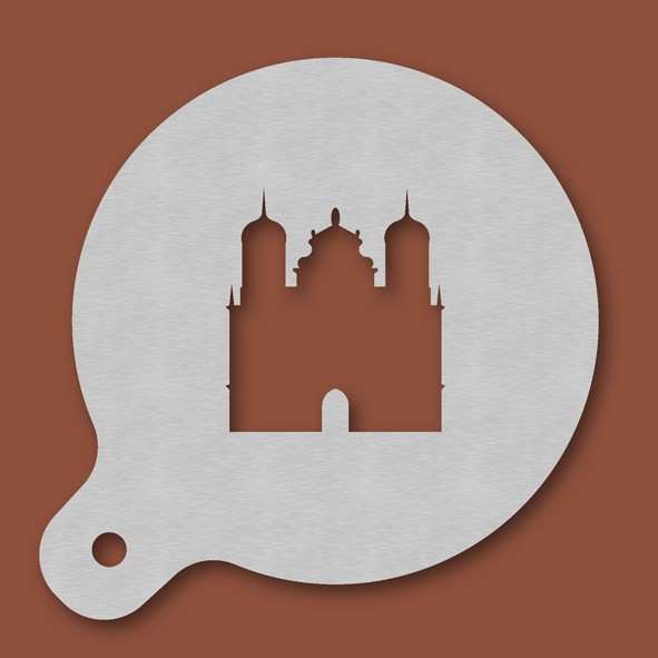 Cappuccino-Schablone Augsburg Rathaus, Außendurchmesser 120 mm, Motivdurchmesser ca. 70 mm, aus Edelstahl mit Handgriff und integriertem Aufhänger, spülmaschinengeeignet, Lieferung in Verkaufsverpackung mit Kartoneinlage und Bedienungsanleitung