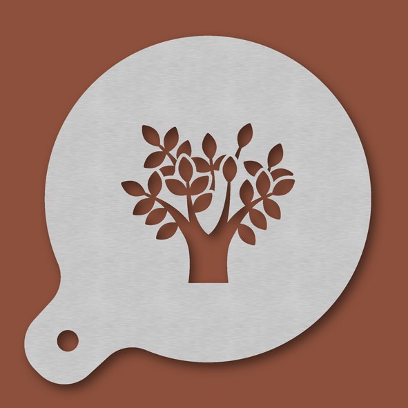 Cappuccino-Schablone Baum, Außendurchmesser 120 mm, Motivdurchmesser ca. 70 mm, aus Edelstahl mit Handgriff und integriertem Aufhänger, spülmaschinengeeignet, Lieferung in Verkaufsverpackung mit Kartoneinlage und Bedienungsanleitung