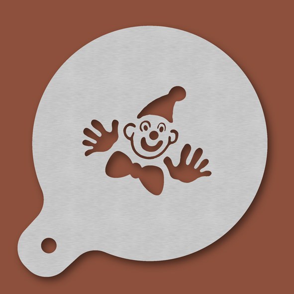 Cappuccino-Schablone Clown, Außendurchmesser 120 mm, Motivdurchmesser ca. 70 mm, aus Edelstahl mit Handgriff und integriertem Aufhänger, spülmaschinengeeignet, Lieferung in Verkaufsverpackung mit Kartoneinlage und Bedienungsanleitung