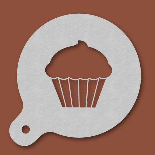 Cappuccino-Schablone Cupcake - Muffin, Außendurchmesser 120 mm, Motivdurchmesser ca. 70 mm, aus Edelstahl mit Handgriff und integriertem Aufhänger, spülmaschinengeeignet, Lieferung in Verkaufsverpackung mit Kartoneinlage und Bedienungsanleitung