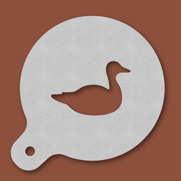 Cappuccino-Schablone Ente, Außendurchmesser 120 mm, Motivdurchmesser ca. 70 mm, aus Edelstahl mit Handgriff und integriertem Aufhänger, spülmaschinengeeignet, Lieferung in Verkaufsverpackung mit Kartoneinlage und Bedienungsanleitung