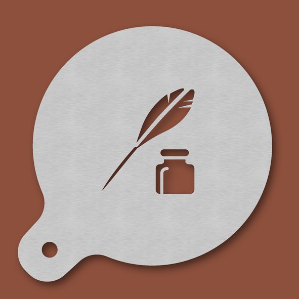 Cappuccino-Schablone Feder & Tintenfass, Außendurchmesser 120 mm, Motivdurchmesser ca. 70 mm, aus Edelstahl mit Handgriff und integriertem Aufhänger, spülmaschinengeeignet, Lieferung in Verkaufsverpackung mit Kartoneinlage und Bedienungsanleitung