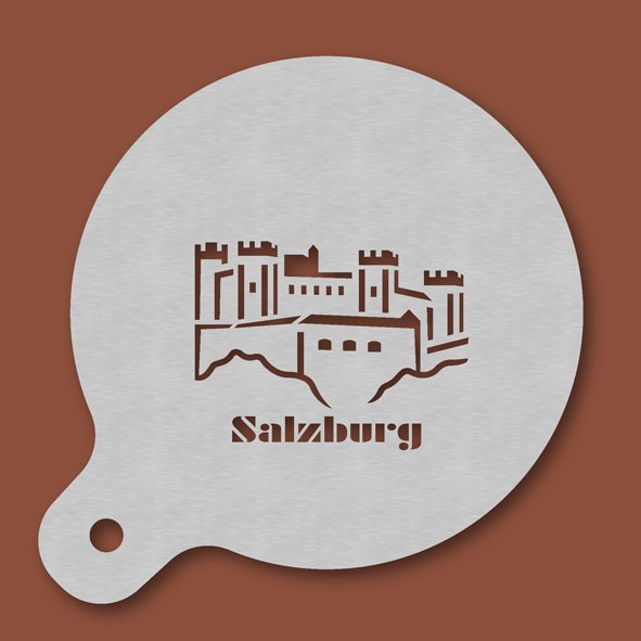 Cappuccino-Schablone Festung Hohensalzburg mit Text, Außendurchmesser 120 mm, Motivdurchmesser ca. 70 mm, aus Edelstahl mit Handgriff und integriertem Aufhänger, spülmaschinengeeignet, Lieferung in Verkaufsverpackung mit Kartoneinlage und Bedienungsanleitung