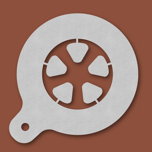 Cappuccino-Schablone Filmrolle, Außendurchmesser 120 mm, Motivdurchmesser ca. 70 mm, aus Edelstahl mit Handgriff und integriertem Aufhänger, spülmaschinengeeignet, Lieferung in Verkaufsverpackung mit Kartoneinlage und Bedienungsanleitung