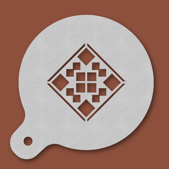 Cappuccino-Schablone Fliesenleger, Außendurchmesser 120 mm, Motivdurchmesser ca. 70 mm, aus Edelstahl mit Handgriff und integriertem Aufhänger, spülmaschinengeeignet, Lieferung in Verkaufsverpackung mit Kartoneinlage und Bedienungsanleitung