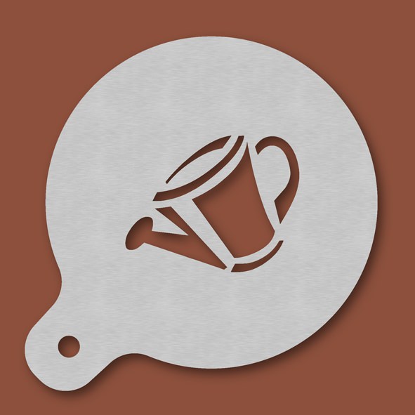 Cappuccino-Schablone Gießkanne, Außendurchmesser 120 mm, Motivdurchmesser ca. 70 mm, aus Edelstahl mit Handgriff und integriertem Aufhänger, spülmaschinengeeignet, Lieferung in Verkaufsverpackung mit Kartoneinlage und Bedienungsanleitung