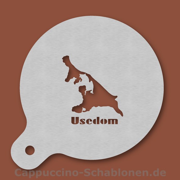 Cappuccino-Schablone Insel Usedom mit Text, Außendurchmesser 120 mm, Motivdurchmesser ca. 70 mm, aus Edelstahl mit Handgriff und integriertem Aufhänger, spülmaschinengeeignet, Lieferung in Verkaufsverpackung mit Kartoneinlage und Bedienungsanleitung