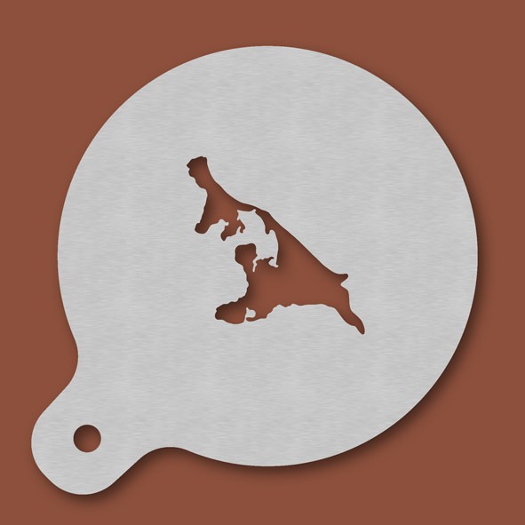 Cappuccino-Schablone Insel Usedom, Außendurchmesser 120 mm, Motivdurchmesser ca. 70 mm, aus Edelstahl mit Handgriff und integriertem Aufhänger, spülmaschinengeeignet, Lieferung in Verkaufsverpackung mit Kartoneinlage und Bedienungsanleitung
