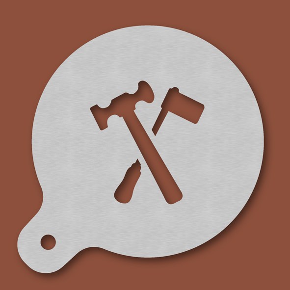 Cappuccino-Schablone Installateur, Außendurchmesser 120 mm, Motivdurchmesser ca. 70 mm, aus Edelstahl mit Handgriff und integriertem Aufhänger, spülmaschinengeeignet, Lieferung in Verkaufsverpackung mit Kartoneinlage und Bedienungsanleitung