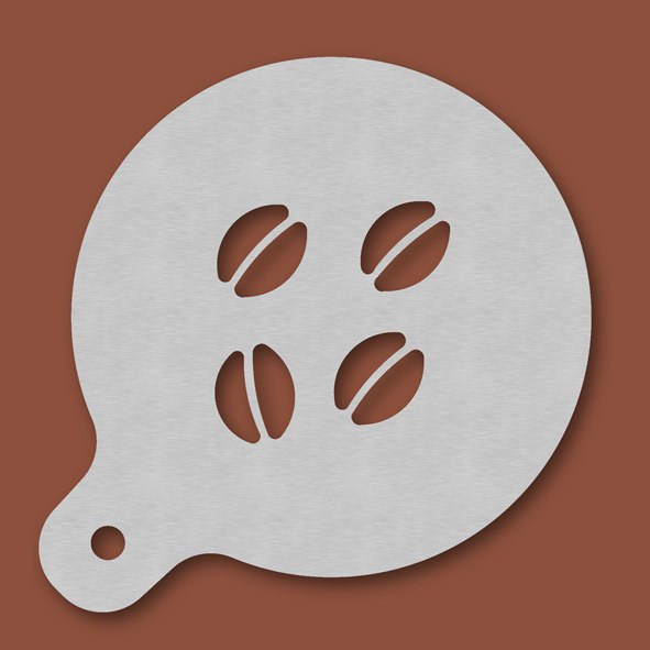 Cappuccino-Schablone Kaffeebohnen, Außendurchmesser 120 mm, Motivdurchmesser ca. 70 mm, aus Edelstahl mit Handgriff und integriertem Aufhänger, spülmaschinengeeignet, Lieferung in Verkaufsverpackung mit Kartoneinlage und Bedienungsanleitung