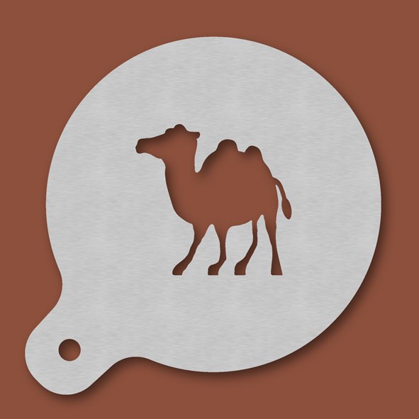 Cappuccino-Schablone Kamel, Außendurchmesser 120 mm, Motivdurchmesser ca. 70 mm, aus Edelstahl mit Handgriff und integriertem Aufhänger, spülmaschinengeeignet, Lieferung in Verkaufsverpackung mit Kartoneinlage und Bedienungsanleitung