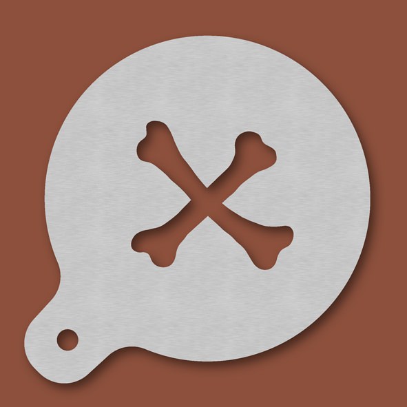 Cappuccino-Schablone Knochen, Außendurchmesser 120 mm, Motivdurchmesser ca. 70 mm, aus Edelstahl mit Handgriff und integriertem Aufhänger, spülmaschinengeeignet, Lieferung in Verkaufsverpackung mit Kartoneinlage und Bedienungsanleitung