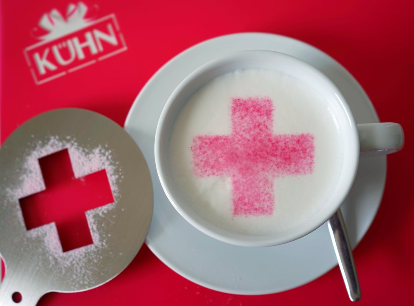 Cappuccino-Schablone Kreuz - Pluszeichen, Außendurchmesser 120 mm, Motivdurchmesser ca. 70 mm, aus Edelstahl mit Handgriff und integriertem Aufhänger, spülmaschinengeeignet, Lieferung in Verkaufsverpackung mit Kartoneinlage und Bedienungsanleitung