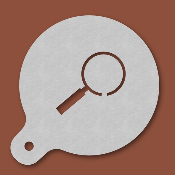 Cappuccino-Schablone Lupe, Außendurchmesser 120 mm, Motivdurchmesser ca. 70 mm, aus Edelstahl mit Handgriff und integriertem Aufhänger, spülmaschinengeeignet, Lieferung in Verkaufsverpackung mit Kartoneinlage und Bedienungsanleitung