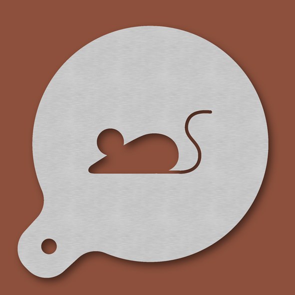 Cappuccino-Schablone Maus, Außendurchmesser 120 mm, Motivdurchmesser ca. 70 mm, aus Edelstahl mit Handgriff und integriertem Aufhänger, spülmaschinengeeignet, Lieferung in Verkaufsverpackung mit Kartoneinlage und Bedienungsanleitung