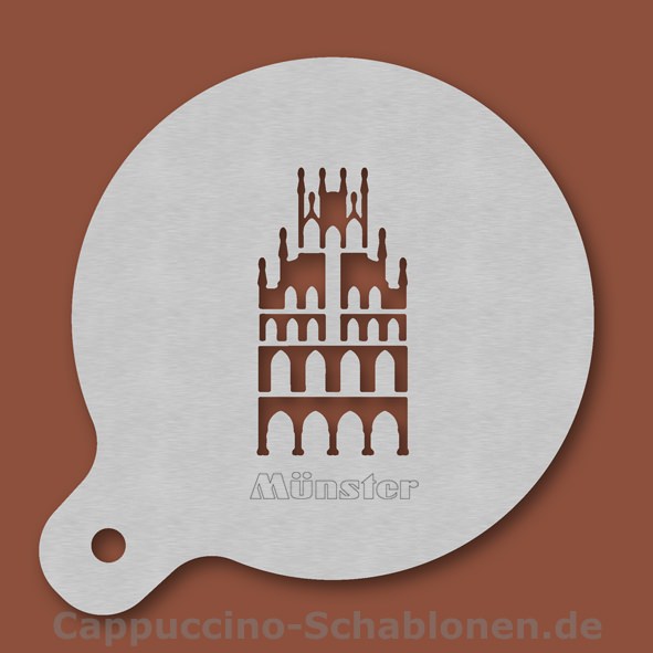 Cappuccino-Schablone Münster Rathaus mit Text (Lasergravur), Außendurchmesser 120 mm, Motivdurchmesser ca. 70 mm, aus Edelstahl mit Handgriff und integriertem Aufhänger, spülmaschinengeeignet, Lieferung in Verkaufsverpackung mit Kartoneinlage und Bedienungsanleitung