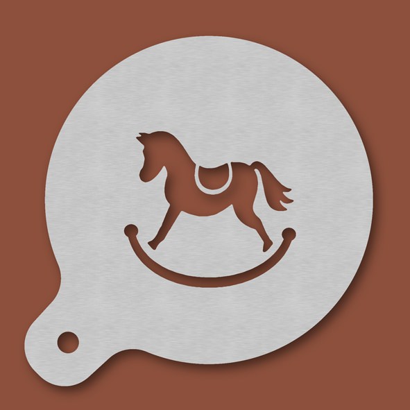 Cappuccino-Schablone Schaukelpferd, Außendurchmesser 120 mm, Motivdurchmesser ca. 70 mm, aus Edelstahl mit Handgriff und integriertem Aufhänger, spülmaschinengeeignet, Lieferung in Verkaufsverpackung mit Kartoneinlage und Bedienungsanleitung