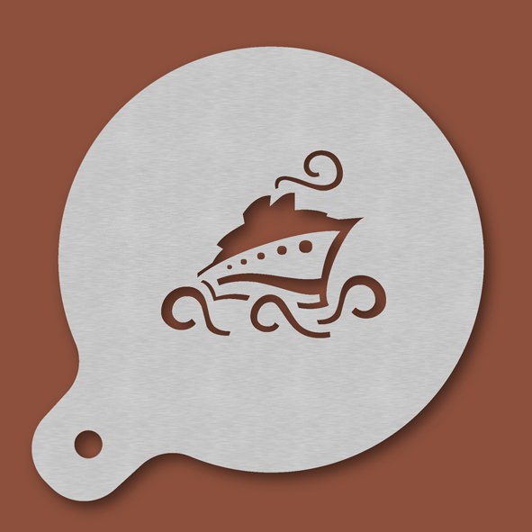 Cappuccino-Schablone Schiff, Außendurchmesser 120 mm, Motivdurchmesser ca. 70 mm, aus Edelstahl mit Handgriff und integriertem Aufhänger, spülmaschinengeeignet, Lieferung in Verkaufsverpackung mit Kartoneinlage und Bedienungsanleitung