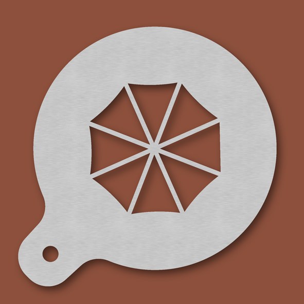 Cappuccino-Schablone Schirm, Außendurchmesser 120 mm, Motivdurchmesser ca. 70 mm, aus Edelstahl mit Handgriff und integriertem Aufhänger, spülmaschinengeeignet, Lieferung in Verkaufsverpackung mit Kartoneinlage und Bedienungsanleitung