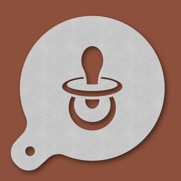 Cappuccino-Schablone Schnuller, Außendurchmesser 120 mm, Motivdurchmesser ca. 70 mm, aus Edelstahl mit Handgriff und integriertem Aufhänger, spülmaschinengeeignet, Lieferung in Verkaufsverpackung mit Kartoneinlage und Bedienungsanleitung