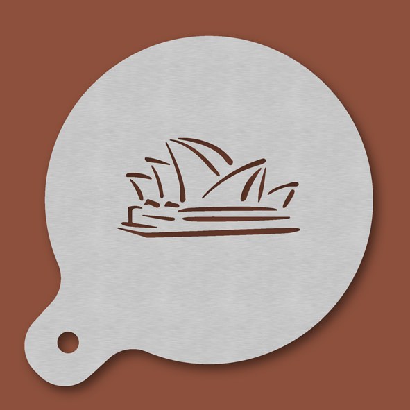 Cappuccino-Schablone Sydney Oper, Außendurchmesser 120 mm, Motivdurchmesser ca. 70 mm, aus Edelstahl mit Handgriff und integriertem Aufhänger, spülmaschinengeeignet, Lieferung in Verkaufsverpackung mit Kartoneinlage und Bedienungsanleitung