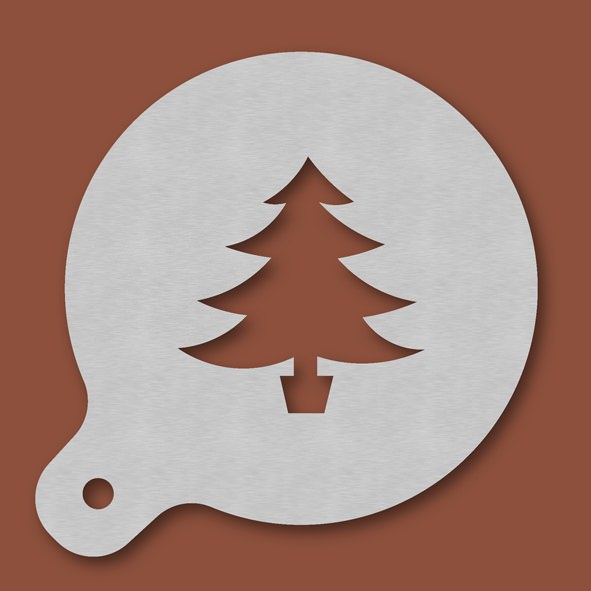 Cappuccino-Schablone Tannenbaum, Außendurchmesser 120 mm, Motivdurchmesser ca. 70 mm, aus Edelstahl mit Handgriff und integriertem Aufhänger, spülmaschinengeeignet, Lieferung in Verkaufsverpackung mit Kartoneinlage und Bedienungsanleitung
