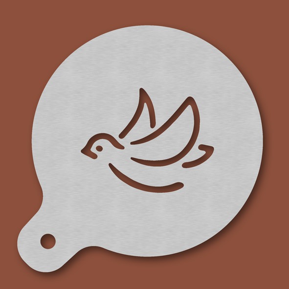 Cappuccino-Schablone Vogel, Außendurchmesser 120 mm, Motivdurchmesser ca. 70 mm, aus Edelstahl mit Handgriff und integriertem Aufhänger, spülmaschinengeeignet, Lieferung in Verkaufsverpackung mit Kartoneinlage und Bedienungsanleitung
