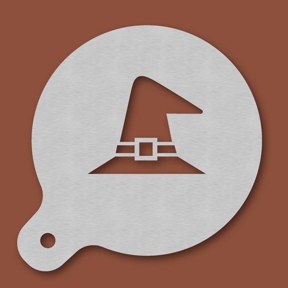 Cappuccino-Schablone Zauberhut, Außendurchmesser 120 mm, Motivdurchmesser ca. 70 mm, aus Edelstahl mit Handgriff und integriertem Aufhänger, spülmaschinengeeignet, Lieferung in Verkaufsverpackung mit Kartoneinlage und Bedienungsanleitung