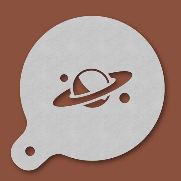 Cappuccino-Schablone Planet, Außendurchmesser 120 mm, Motivdurchmesser ca. 70 mm, aus Edelstahl mit Handgriff und integriertem Aufhänger, spülmaschinengeeignet, Lieferung in Verkaufsverpackung mit Kar ...