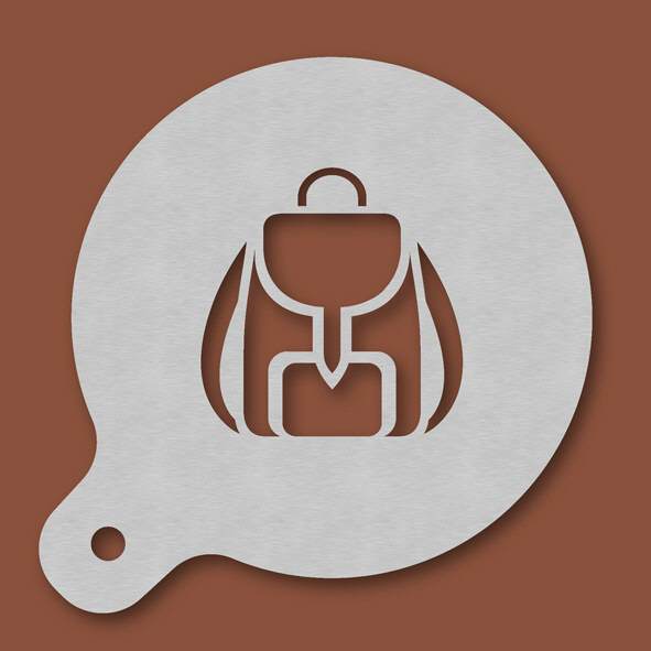 Cappuccino-Schablone Rucksack, Außendurchmesser 120 mm, Motivdurchmesser ca. 70 mm, aus Edelstahl mit Handgriff und integriertem Aufhänger, spülmaschinengeeignet, Lieferung in Verkaufsverpackung mit K ...