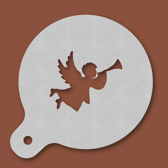 Cappuccino-Schablone Engel fliegend mit Posaune, Außendurchmesser 120 mm, Motivdurchmesser ca. 70 mm, aus Edelstahl mit Handgriff und integriertem Aufhänger, spülmaschinengeeignet, Lieferung in Verkau ...