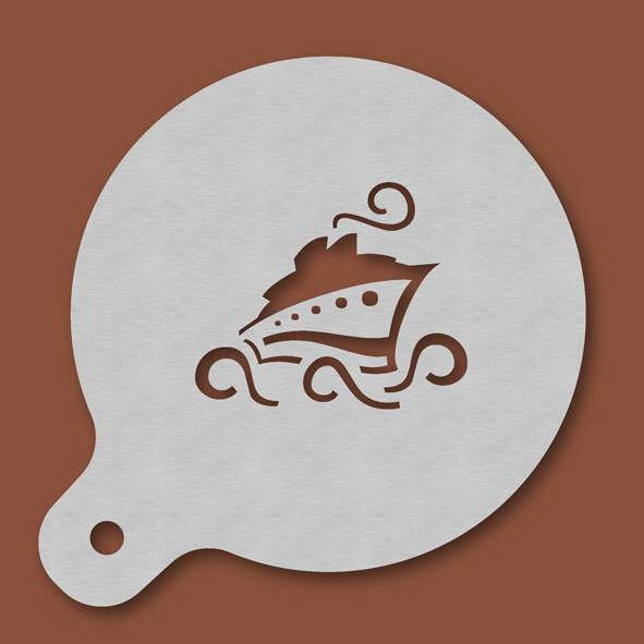 Cappuccino-Schablone Schiff, Außendurchmesser 120 mm, Motivdurchmesser ca. 70 mm, aus Edelstahl mit Handgriff und integriertem Aufhänger, spülmaschinengeeignet, Lieferung in Verkaufsverpackung mit Kar ...