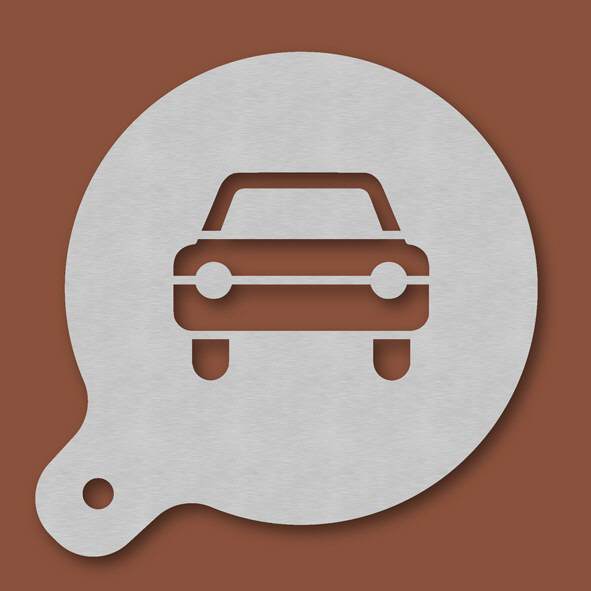 Cappuccino-Schablone Taxi, Außendurchmesser 120 mm, Motivdurchmesser ca. 70 mm, aus Edelstahl mit Handgriff und integriertem Aufhänger, spülmaschinengeeignet, Lieferung in Verkaufsverpackung mit Karto ...