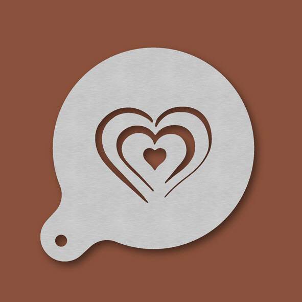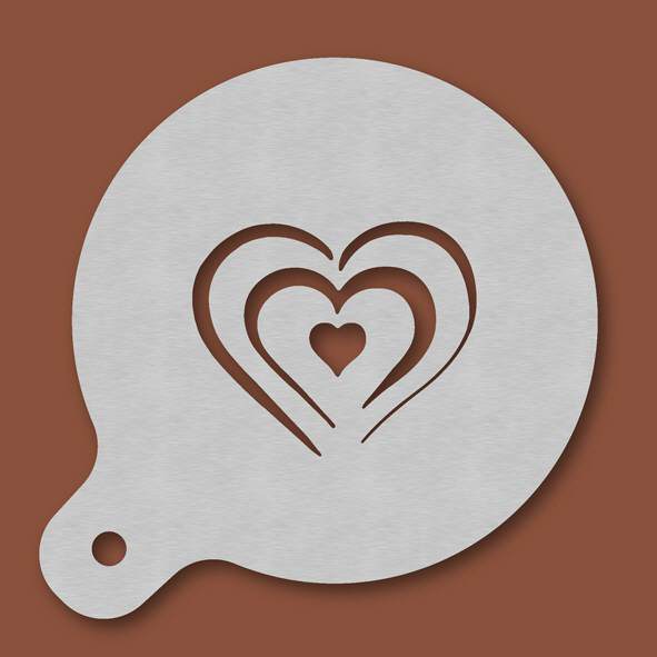 Cappuccino-Schablone Herz, Außendurchmesser 120 mm, Motivdurchmesser ca. 70 mm, aus Edelstahl mit Handgriff und integriertem Aufhänger, spülmaschinengeeignet, Lieferung in Verkaufsverpackung mit Karto ...