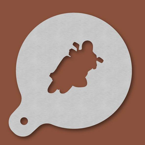 Cappuccino-Schablone Motorradfahrer, Außendurchmesser 120 mm, Motivdurchmesser ca. 70 mm, aus Edelstahl mit Handgriff und integriertem Aufhänger, spülmaschinengeeignet, Lieferung in Verkaufsverpackung ...