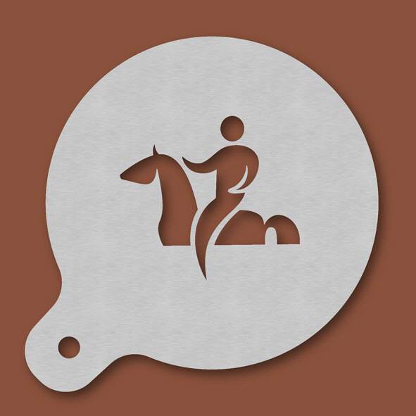 Cappuccino-Schablone Reiter, Außendurchmesser 120 mm, Motivdurchmesser ca. 70 mm, aus Edelstahl mit Handgriff und integriertem Aufhänger, spülmaschinengeeignet, Lieferung in Verkaufsverpackung mit Kar ...