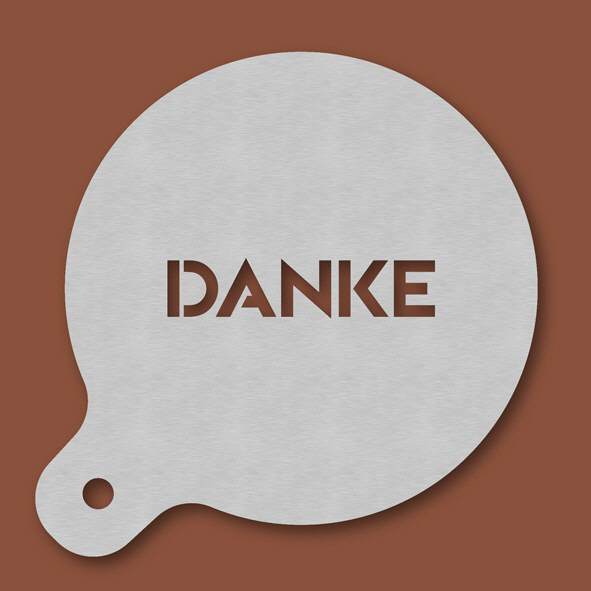 Cappuccino-Schablone Danke, Außendurchmesser 120 mm, Motivdurchmesser ca. 70 mm, aus Edelstahl mit Handgriff und integriertem Aufhänger, spülmaschinengeeignet, Lieferung in Verkaufsverpackung mit Kart ...