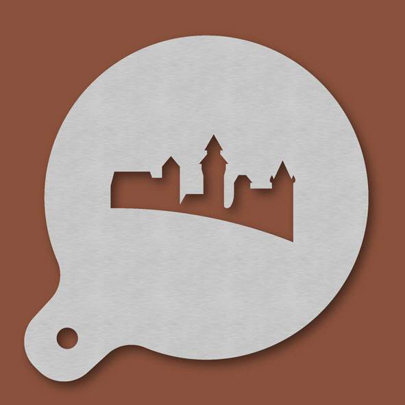 Cappuccino-Schablone Nürnberg Kaiserburg, Außendurchmesser 120 mm, Motivdurchmesser ca. 70 mm, aus Edelstahl mit Handgriff und integriertem Aufhänger, spülmaschinengeeignet, Lieferung in Verkaufsverpa ...