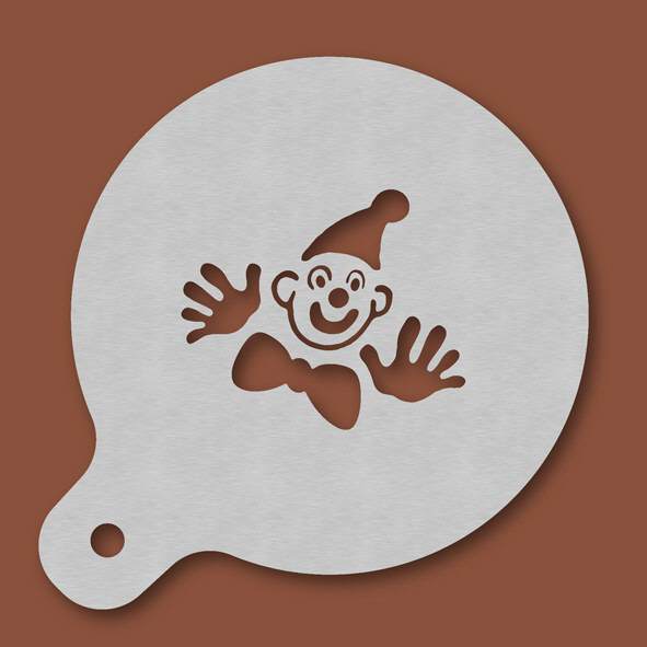 Cappuccino-Schablone Clown, Außendurchmesser 120 mm, Motivdurchmesser ca. 70 mm, aus Edelstahl mit Handgriff und integriertem Aufhänger, spülmaschinengeeignet, Lieferung in Verkaufsverpackung mit Kart ...