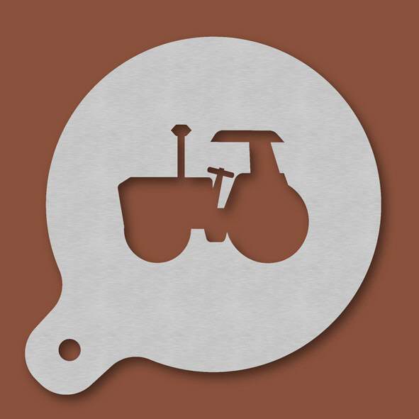 Cappuccino-Schablone Traktor, Außendurchmesser 120 mm, Motivdurchmesser ca. 70 mm, aus Edelstahl mit Handgriff und integriertem Aufhänger, spülmaschinengeeignet, Lieferung in Verkaufsverpackung mit Ka ...