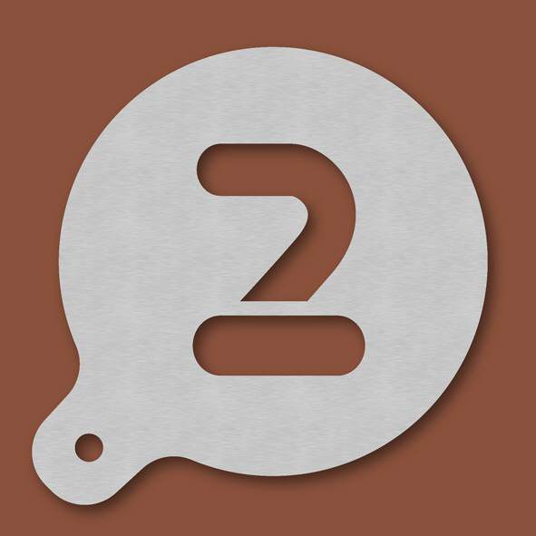 Cappuccino-Schablone Zahl 2, Außendurchmesser 120 mm, Schrifthöhe ca. 65 mm, aus Edelstahl mit Handgriff und integriertem Aufhänger, spülmaschinengeeignet, Lieferung in Verkaufsverpackung mit Kartonei ...